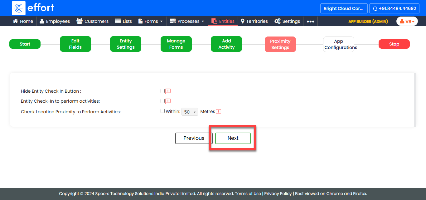 Check Location Proximity to Perform Activities Select this checkbox to require users to be within a specified location proximity to perform activities for the entity. When selected, you need to configure the following options according to your requirements.- Entity Check-In: Require check-in at the entity’s location only.