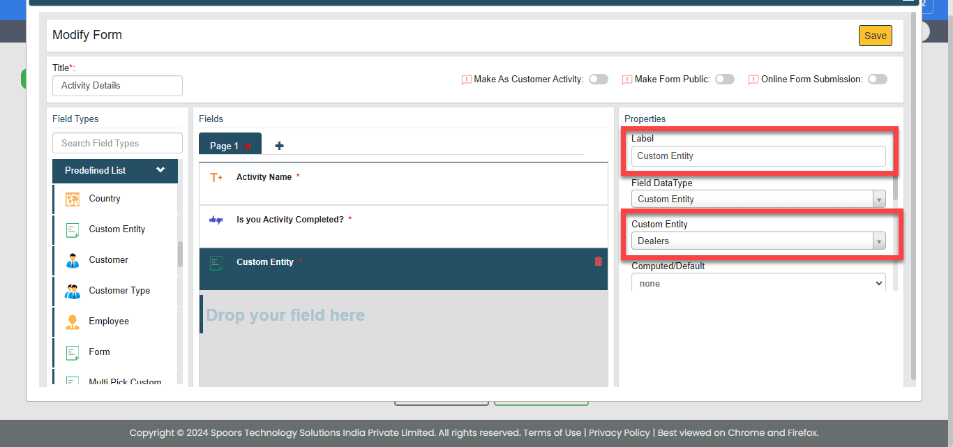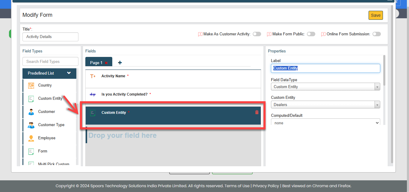 Custom Entity dropdown.