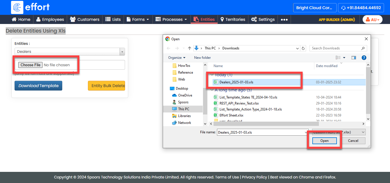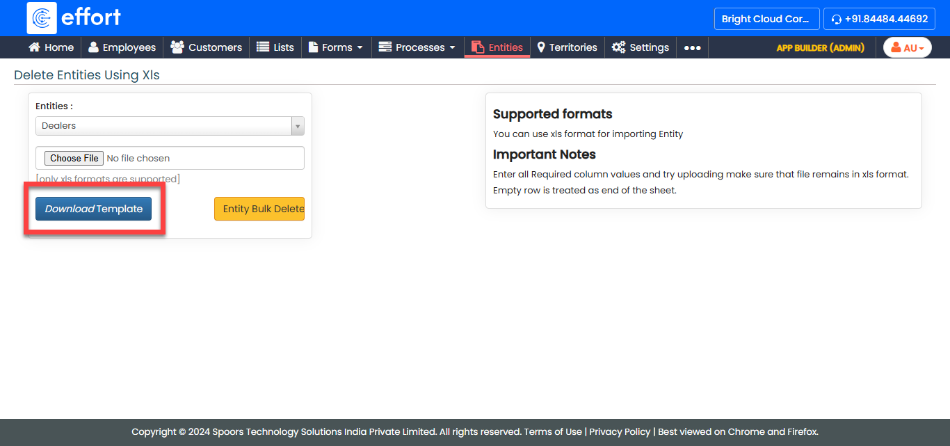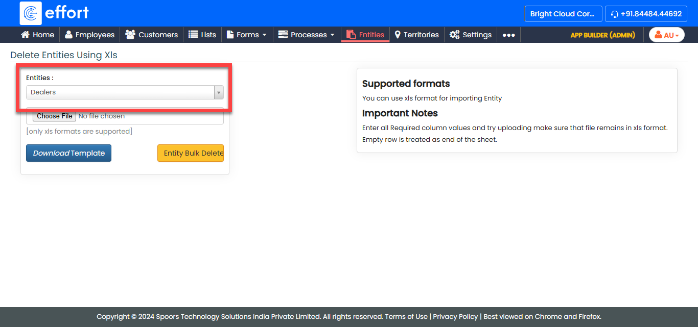 The Delete Entities Using Xls feature enables you to remove multiple entities in bulk by uploading an Excel file. This functionality is especially useful for managing large-scale data operations, reducing the time and effort required for individual deletions.
