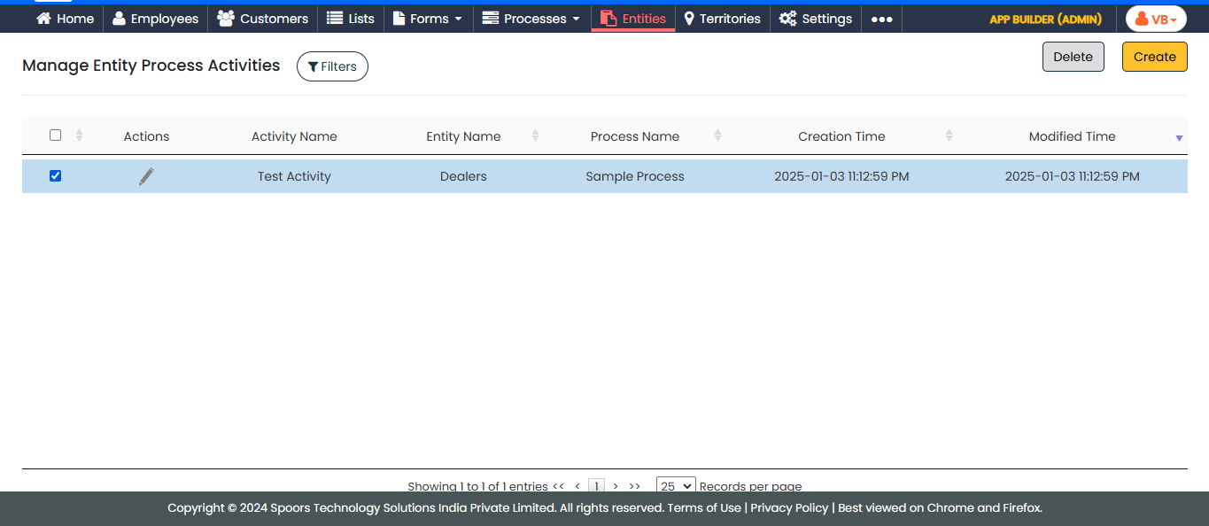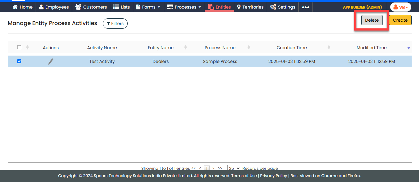 In the Manage Entity Process Activities page, select the