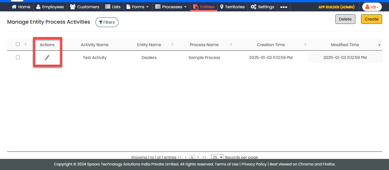 entity activity and click the edit icon under the Actions