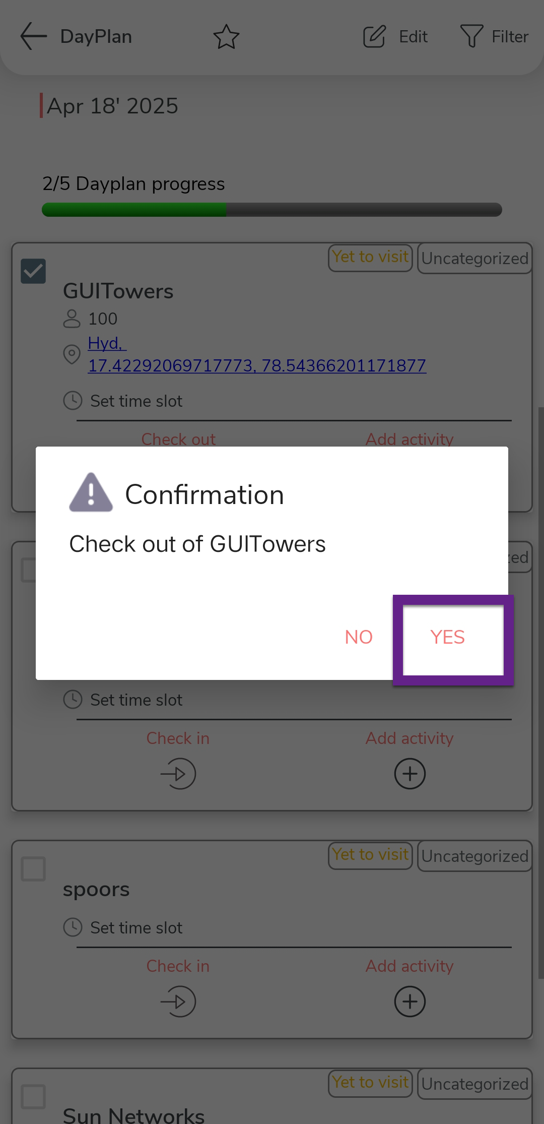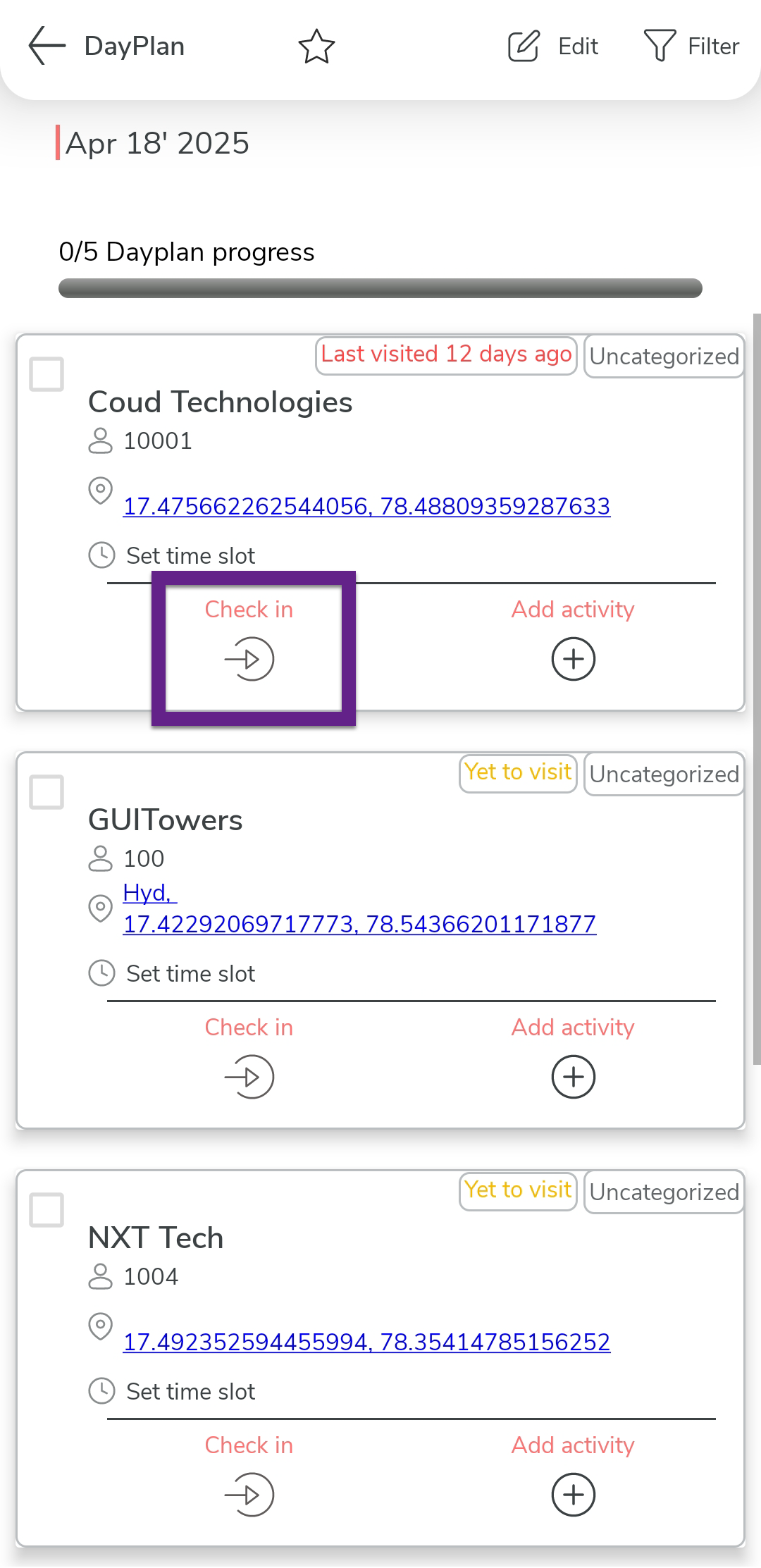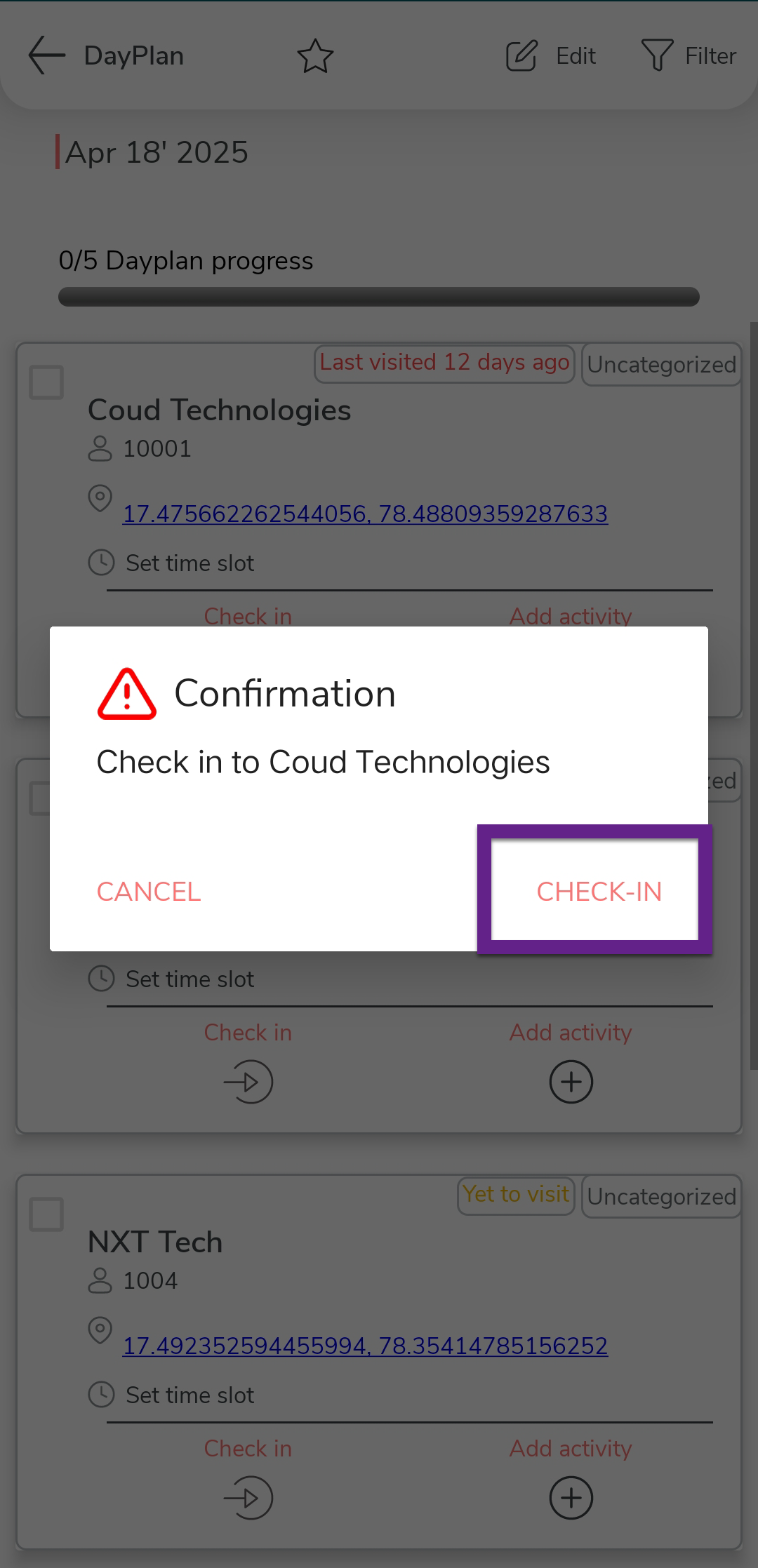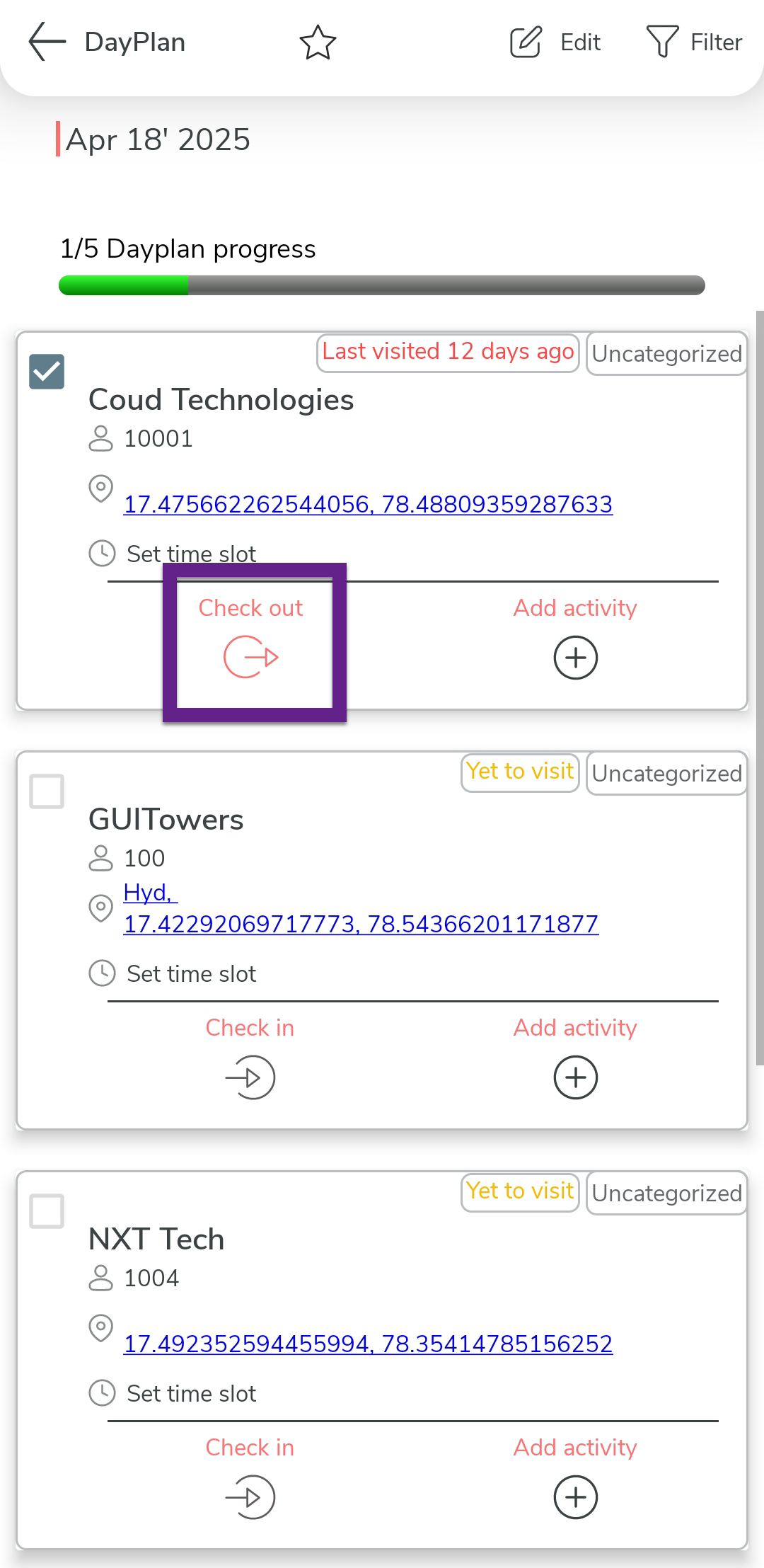 Based on the configuration, checking into a customer automatically may automatically select the customer visit checkbox to mark a visit as done. Progress bar is updated whenever a visit completed checkbox is selected/unselected either manually or automatically. - Optional: