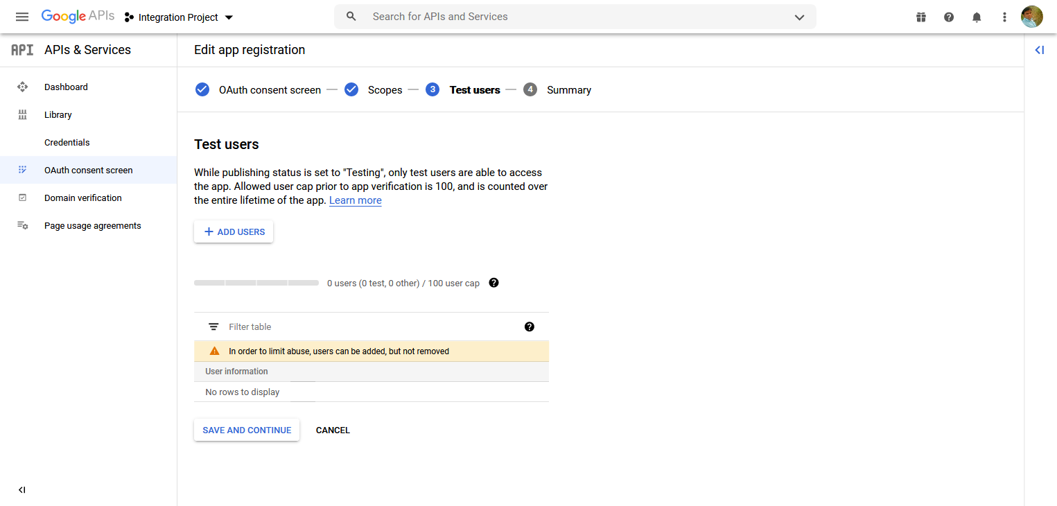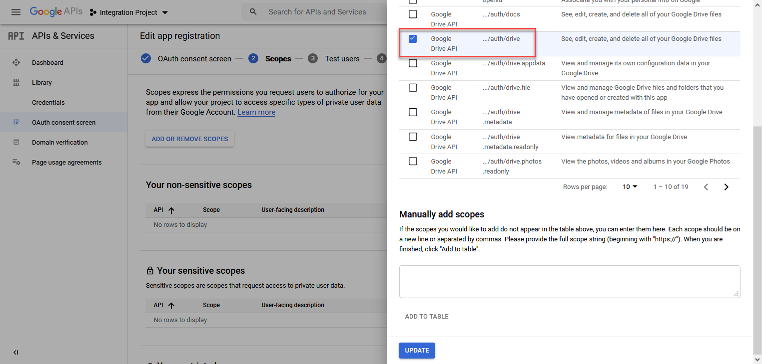 - Make sure you have already enabled the Google Drive API to create application. To enable, refer Enable Google Drive API.