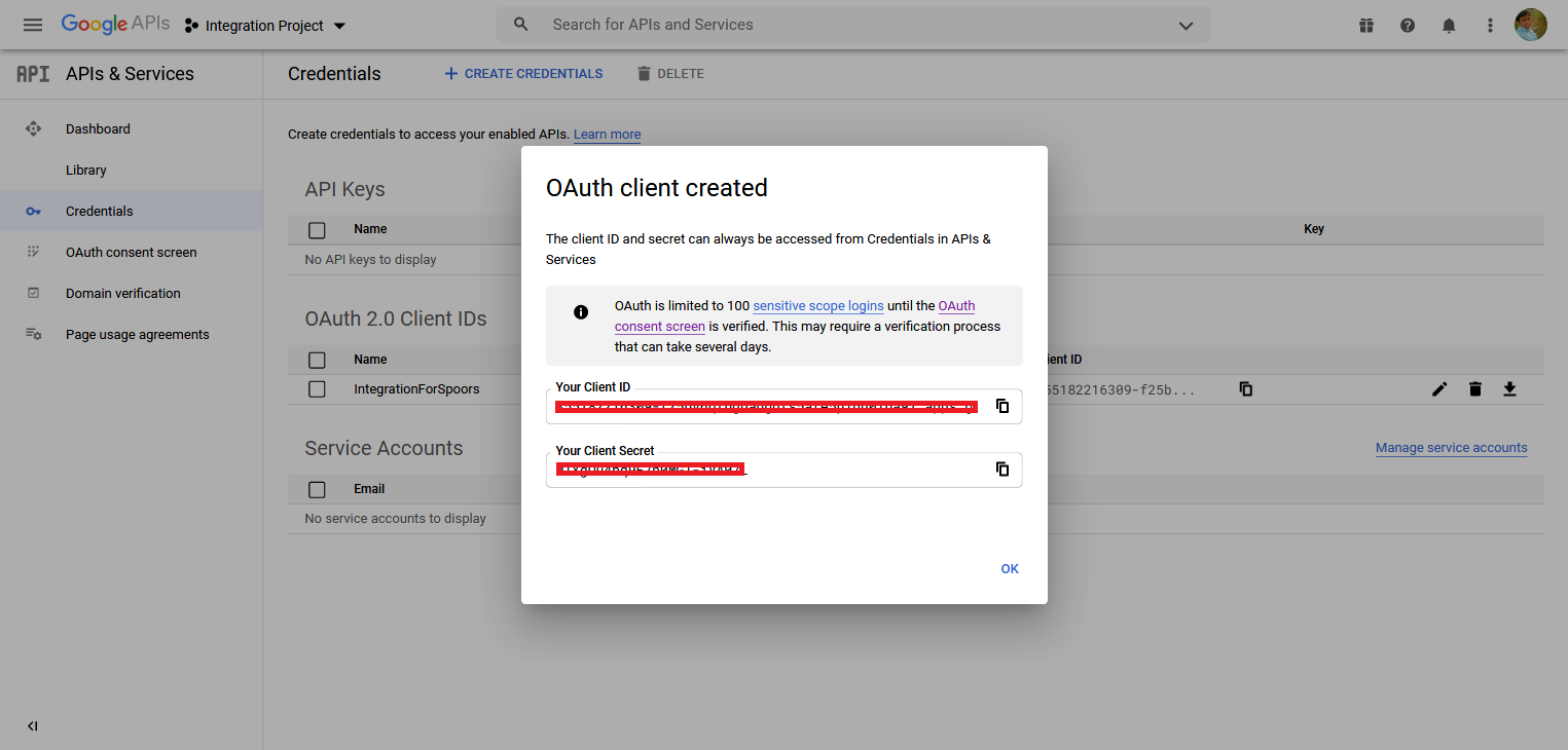 A pop-up window appears with the Client ID and Client Secret details. Copy Name, Client ID, and Client Secret details for further configurations.