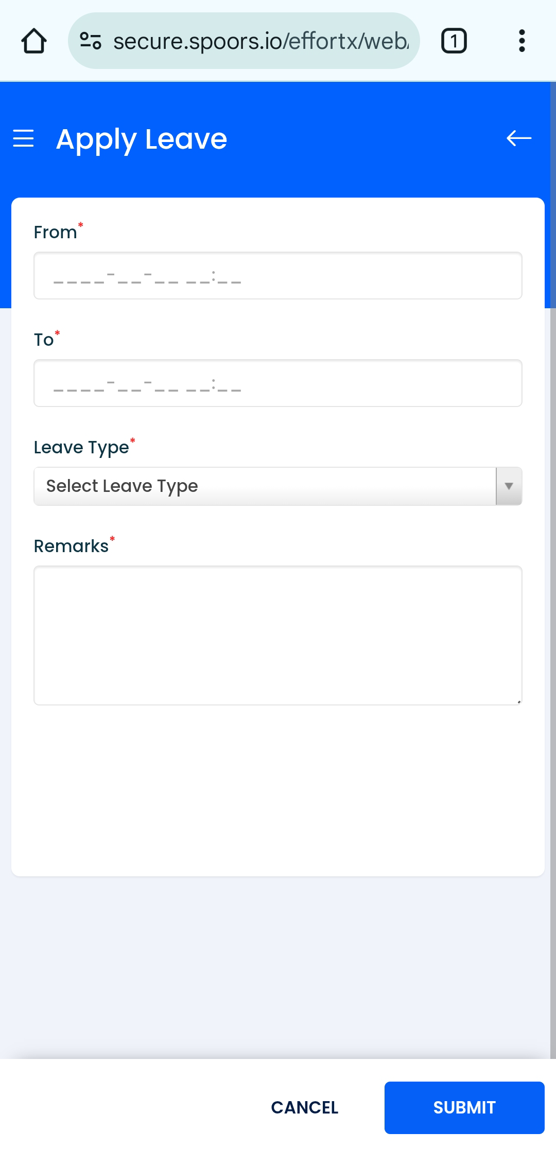 This topic guides you with the step-by-step procedure to apply for a leave in the Effort Web Lite App. You can follow the below steps to apply for a leave in the Web Lite app.