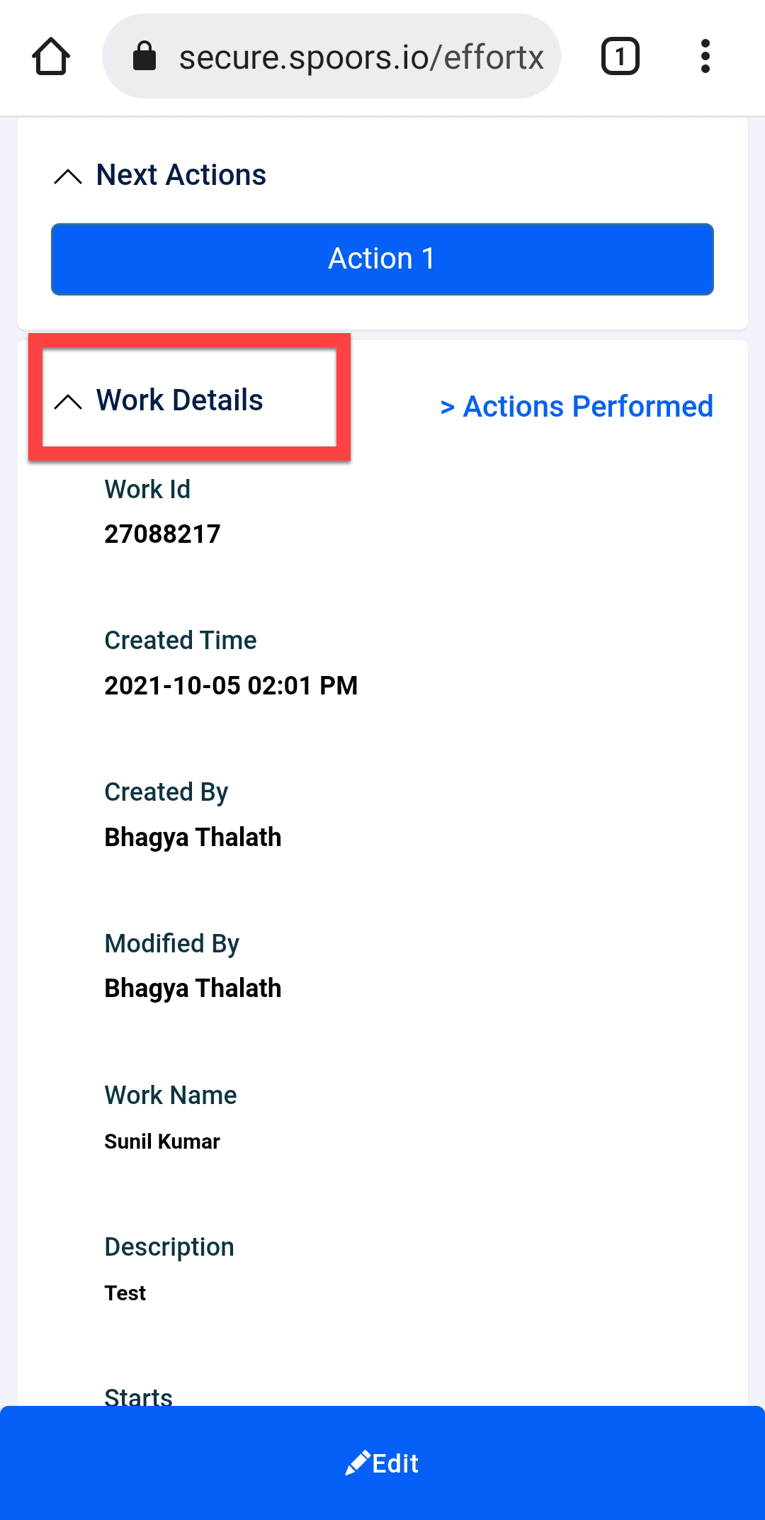 Tap the Work Action button given below the