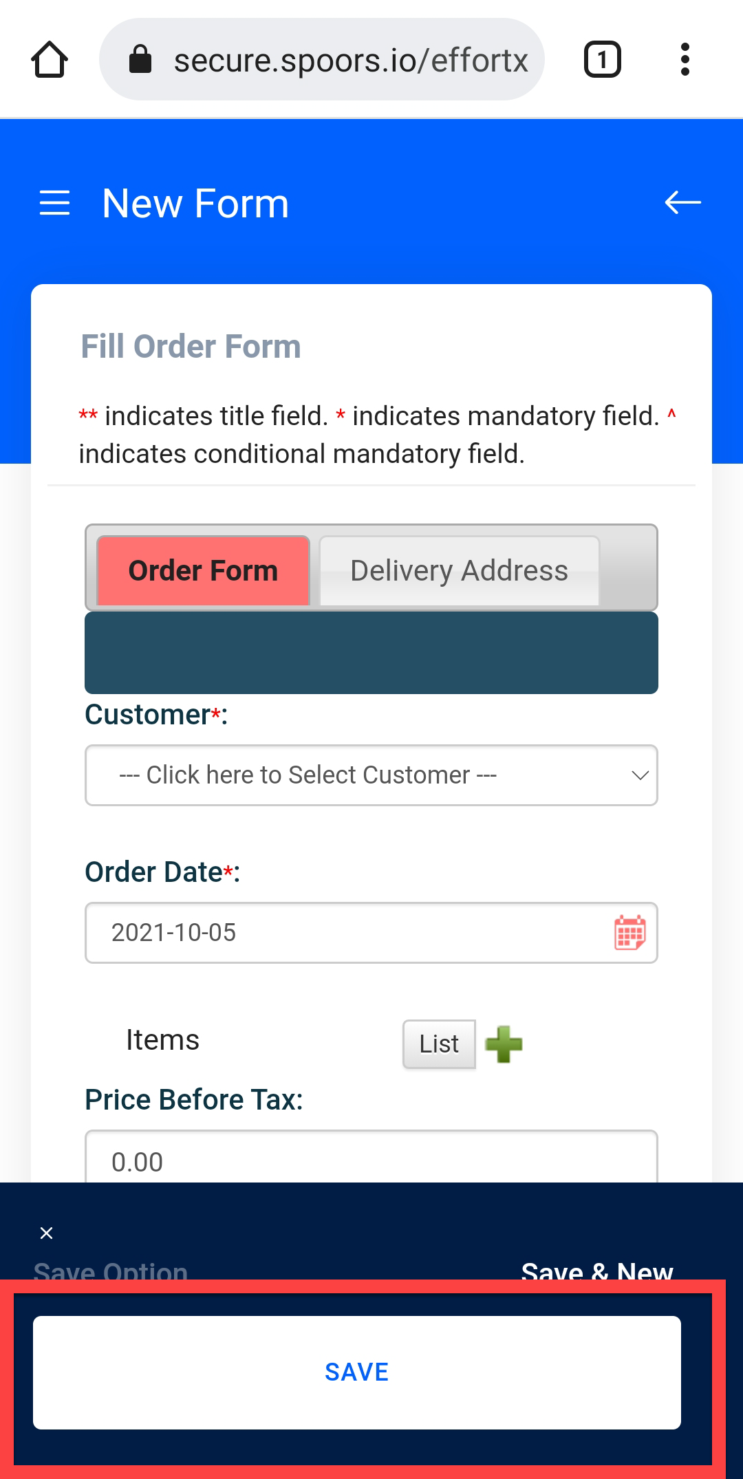 Enter details in the form fields and tap the SAVE