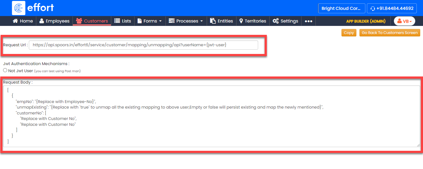 - Request Body: Here, you’ll find a sample request body showing the correct format for your data when performing customer employee mapping and unmapping.
