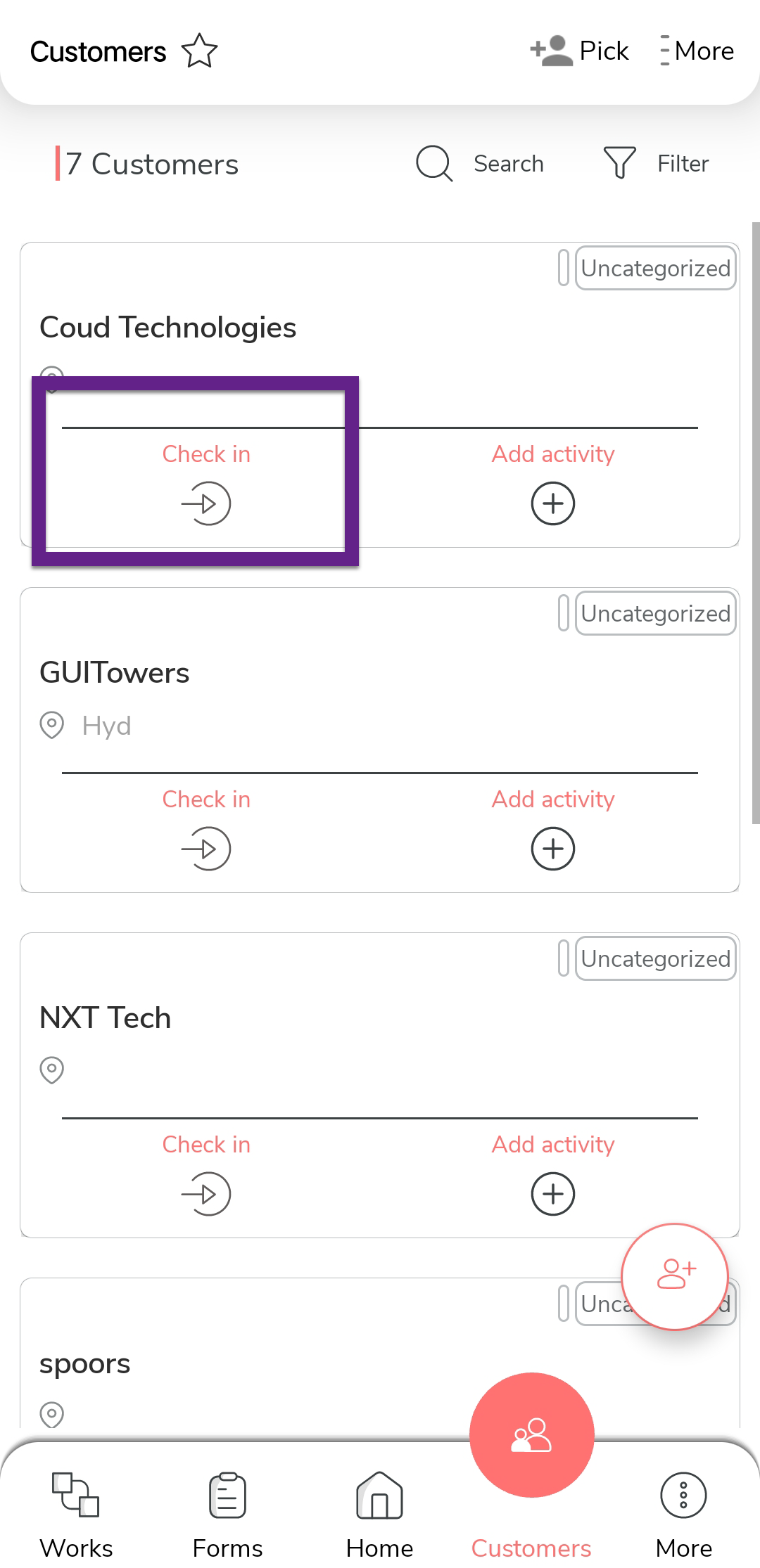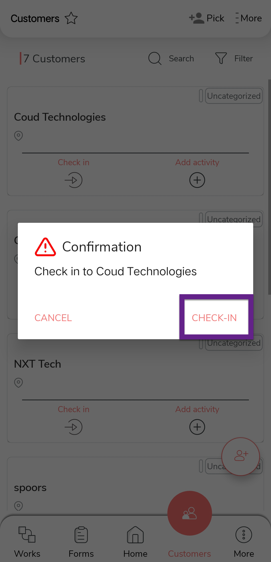 Tap the Check In icon on the desired customer card.