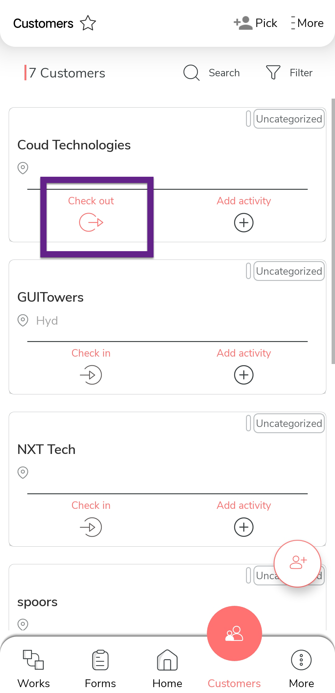 This topic helps you understand how to perform check-in and check-out actions a customer using the mobile app. This feature is useful for logging visits, tracking activity, and maintaining accurate customer interaction records.