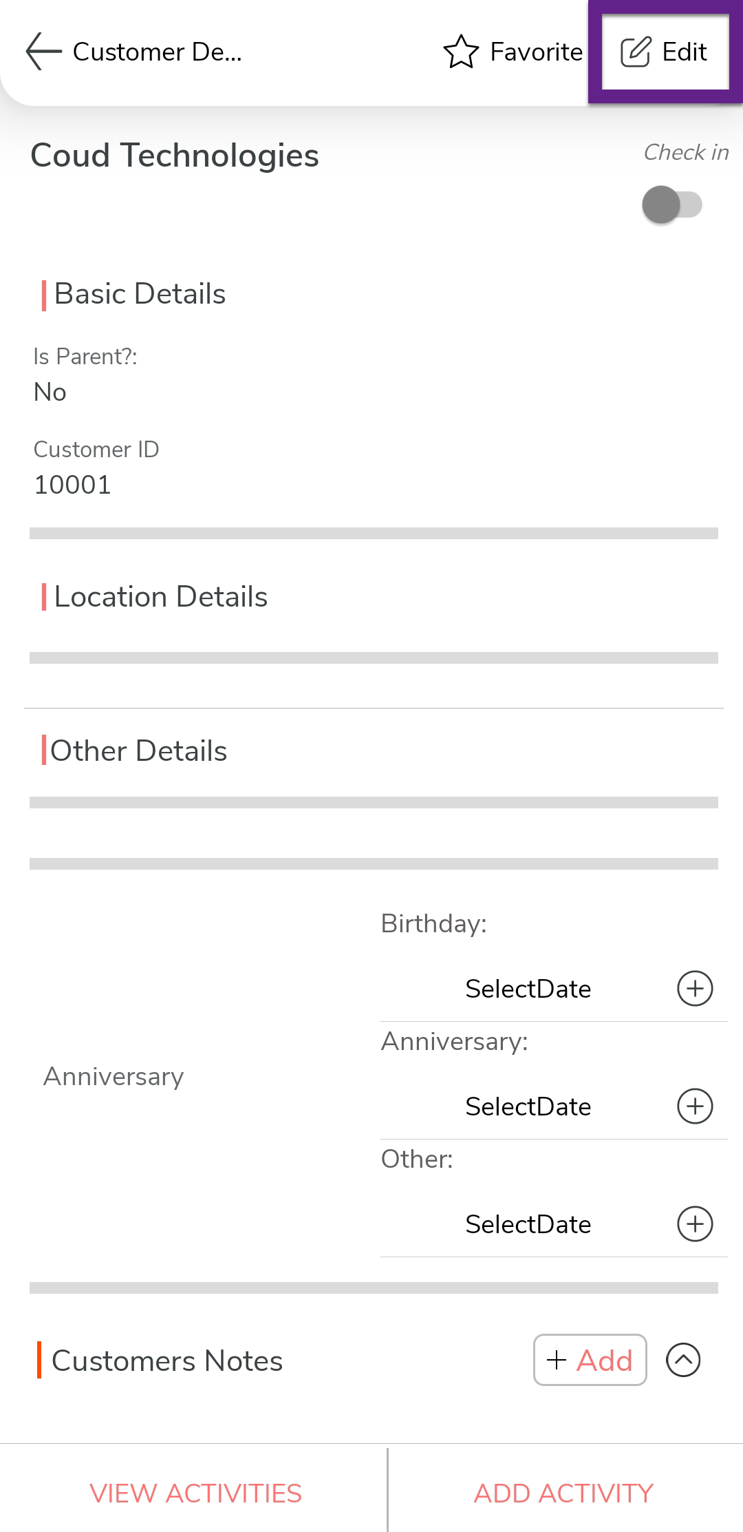 Note:If you do not see the Edit icon, it means you may not have the required permissions. Please contact your admin to request access for modifying customer details.