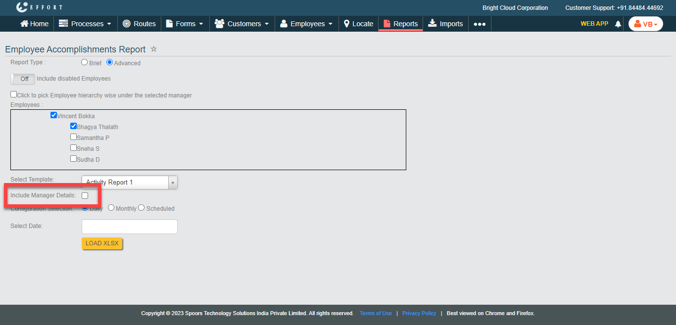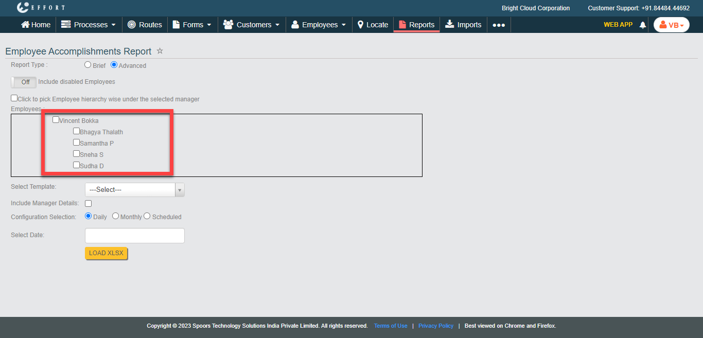 The Advanced Employee Accomplishments Report is generated as per the selected configuration selection with the selected template data.