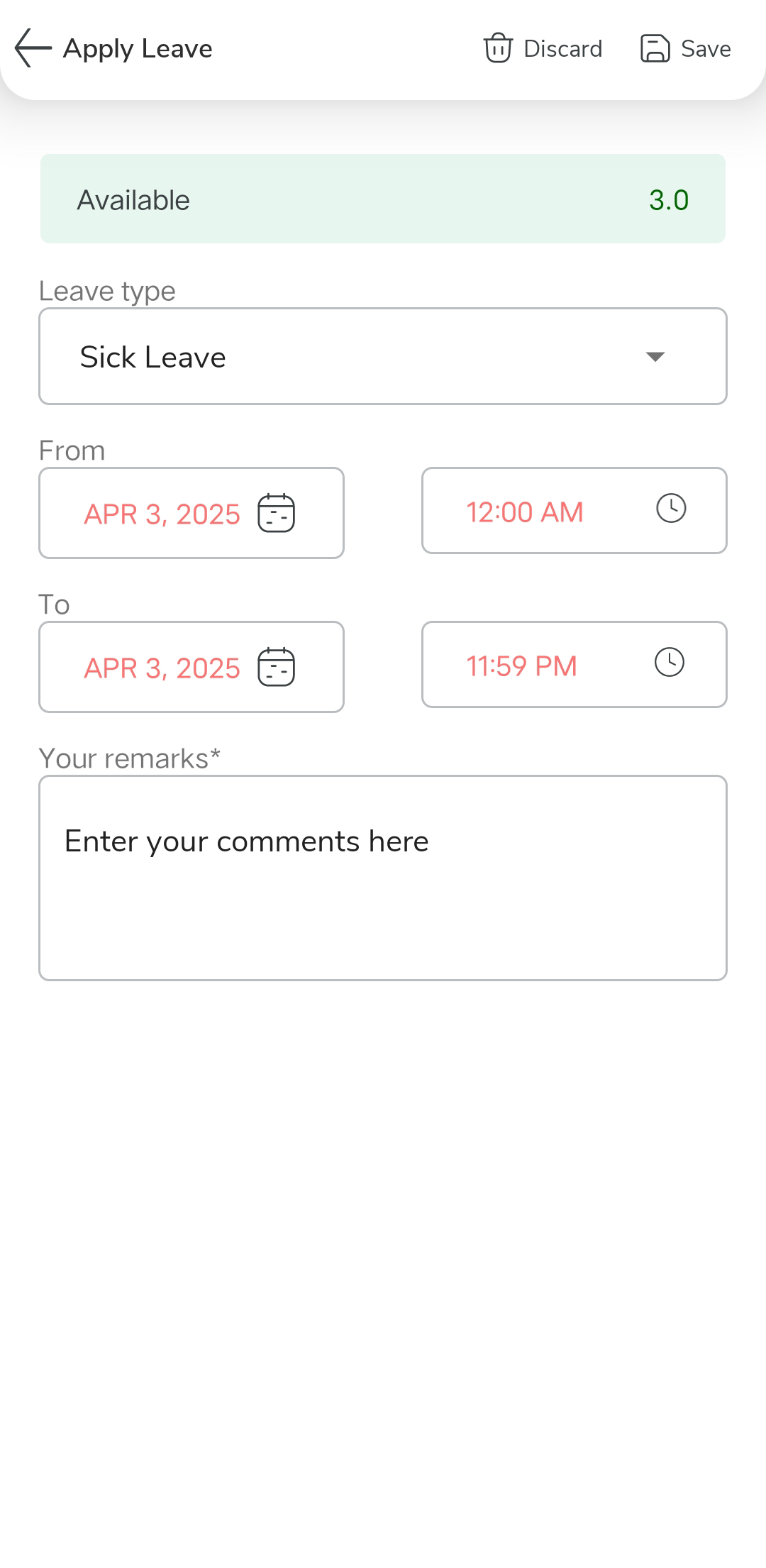 On the Apply Leave page, update the required fields as