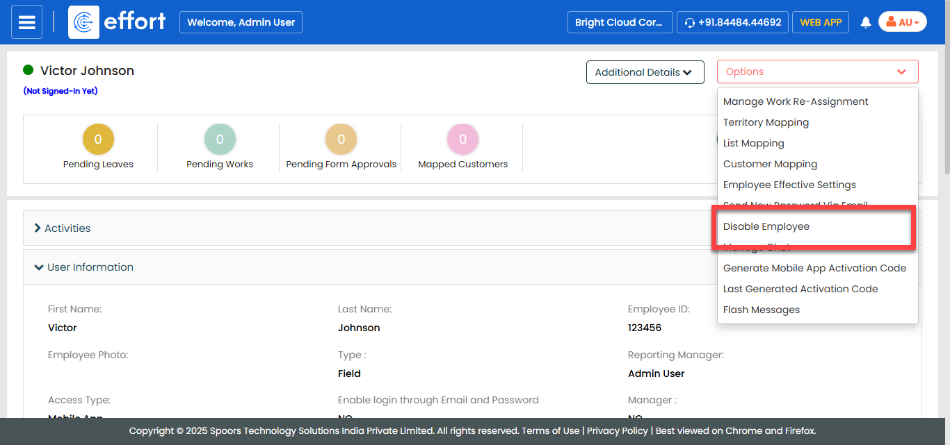 - Disable without assigning works to manager: Select this option to disable the employee without assigning works to his reporting manager.