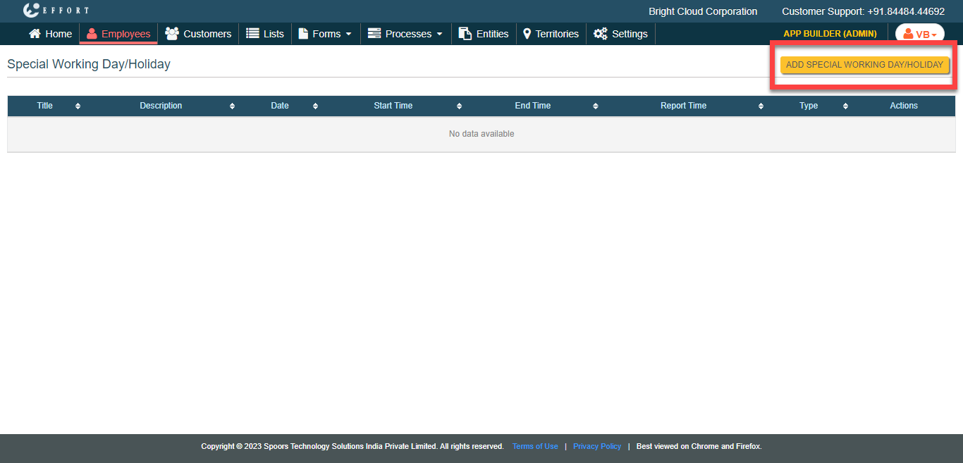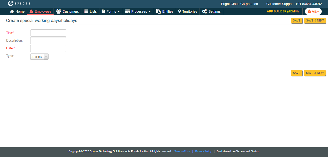 - Type: Select whether the selected is a holiday or working day from the dropdown.