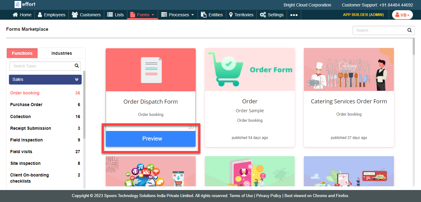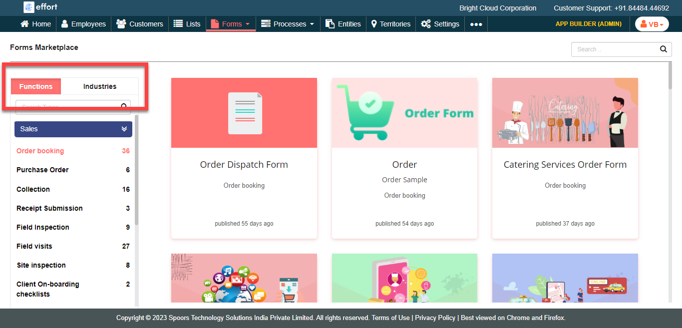 The Forms Marketplace page appears with the Functions and Industries buttons on the left.