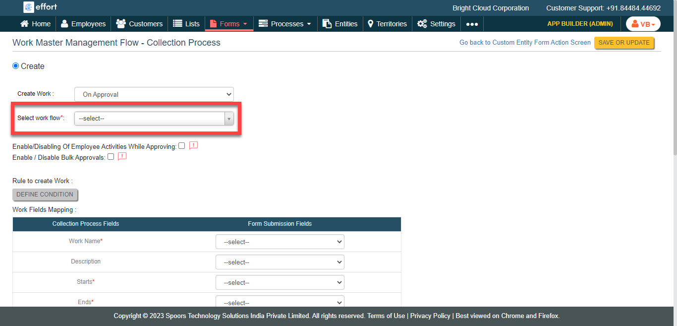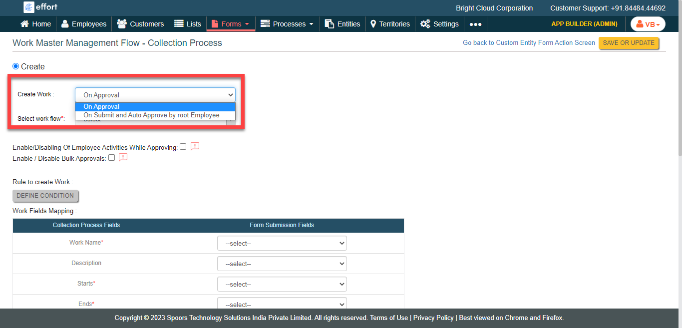 As shown in the above screenshot, the input entered in the Purpose of Visit field while submitting this form will become the Work Name. Accordingly, the work will be created with the inputs entered in the configured form fields. - Click Save or Update.