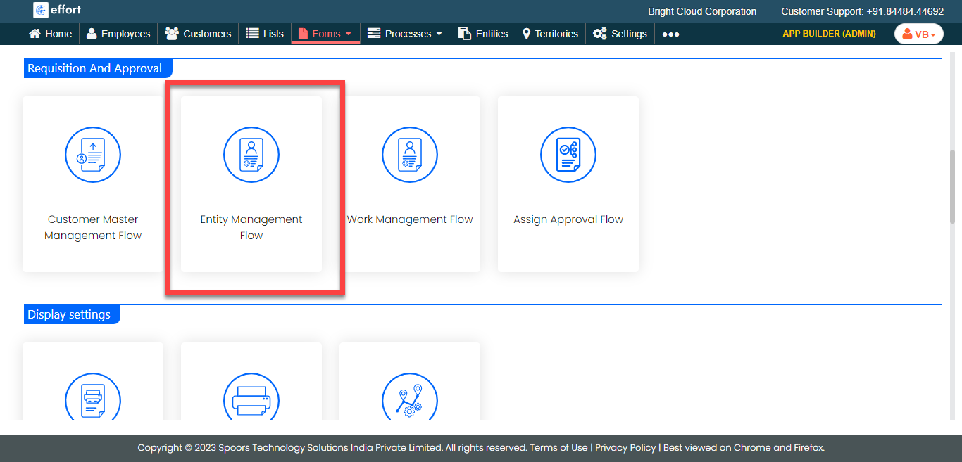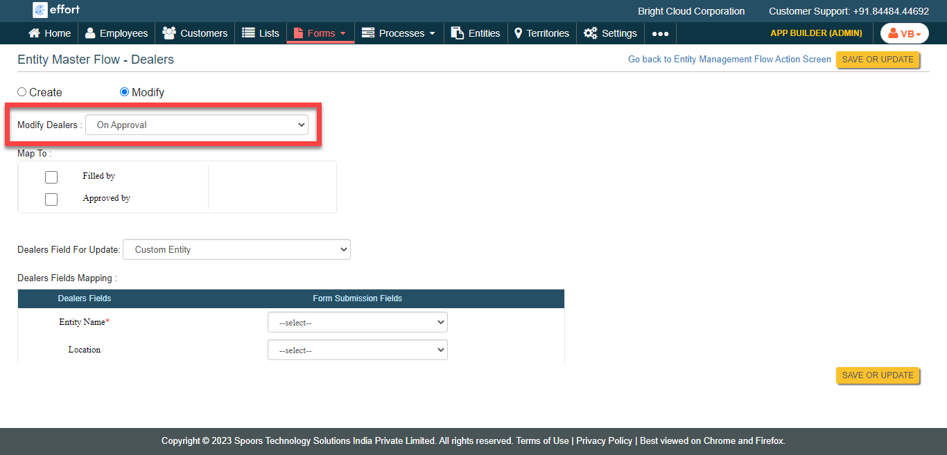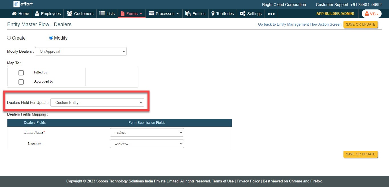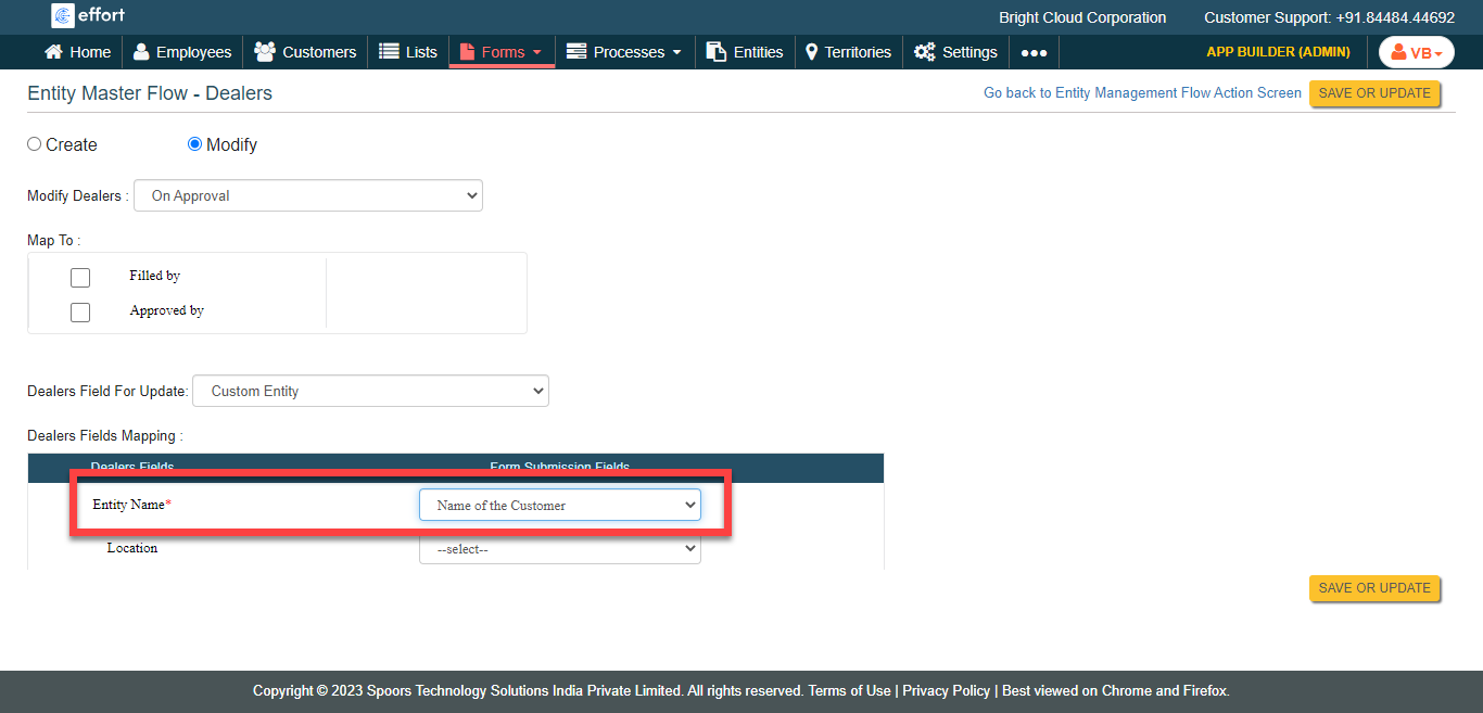 As shown in the above screenshot, the input entered in the Name of the Customer field while submitting this form will become the Entity Name. The entity will be modified with the inputs entered in the configured form fields. - Click Save or Update.