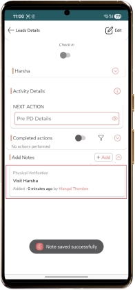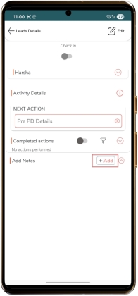 Add Notes Click on “+Add”. Enter “Title”. Enter “Note”. Select “Reminder date & time”. Select the “Attachment” if required Click “Save”.