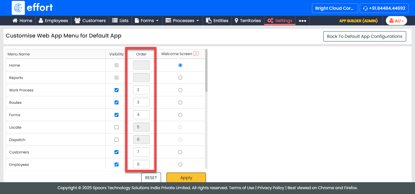 The Customise Web App Menu for Default App page appears.