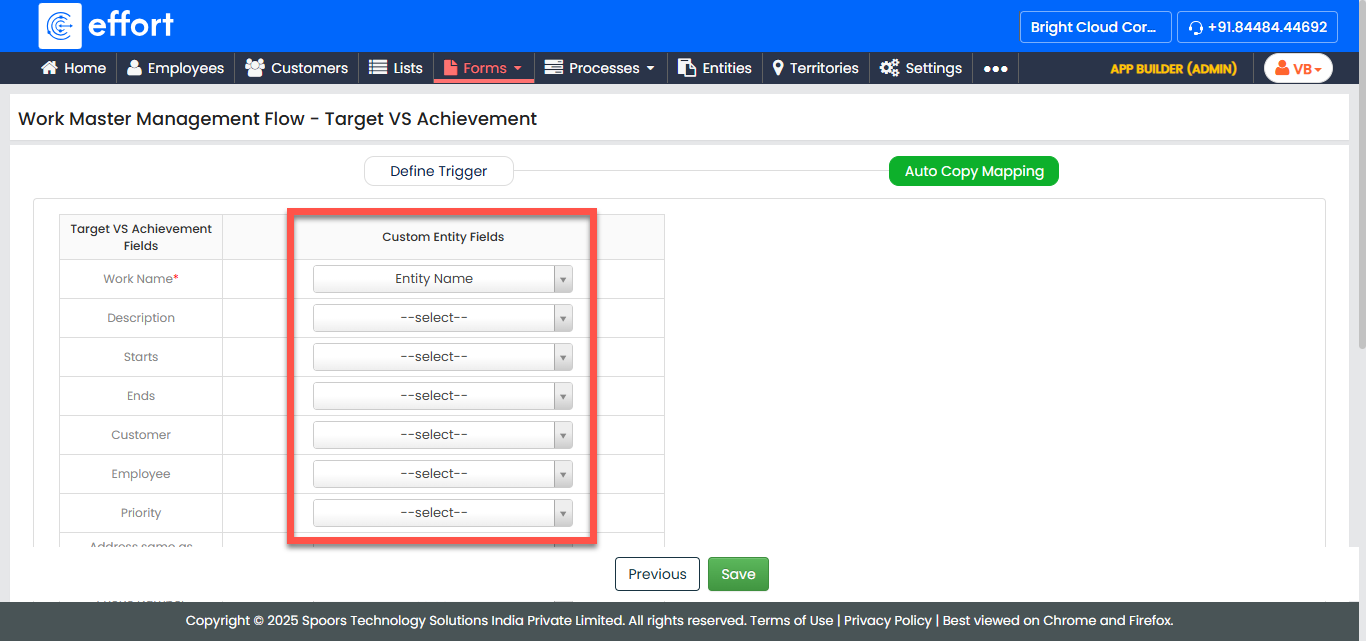 Under the Custom Entity/Customer Fields column, map the relevant entity/customer fields to their corresponding work fields.