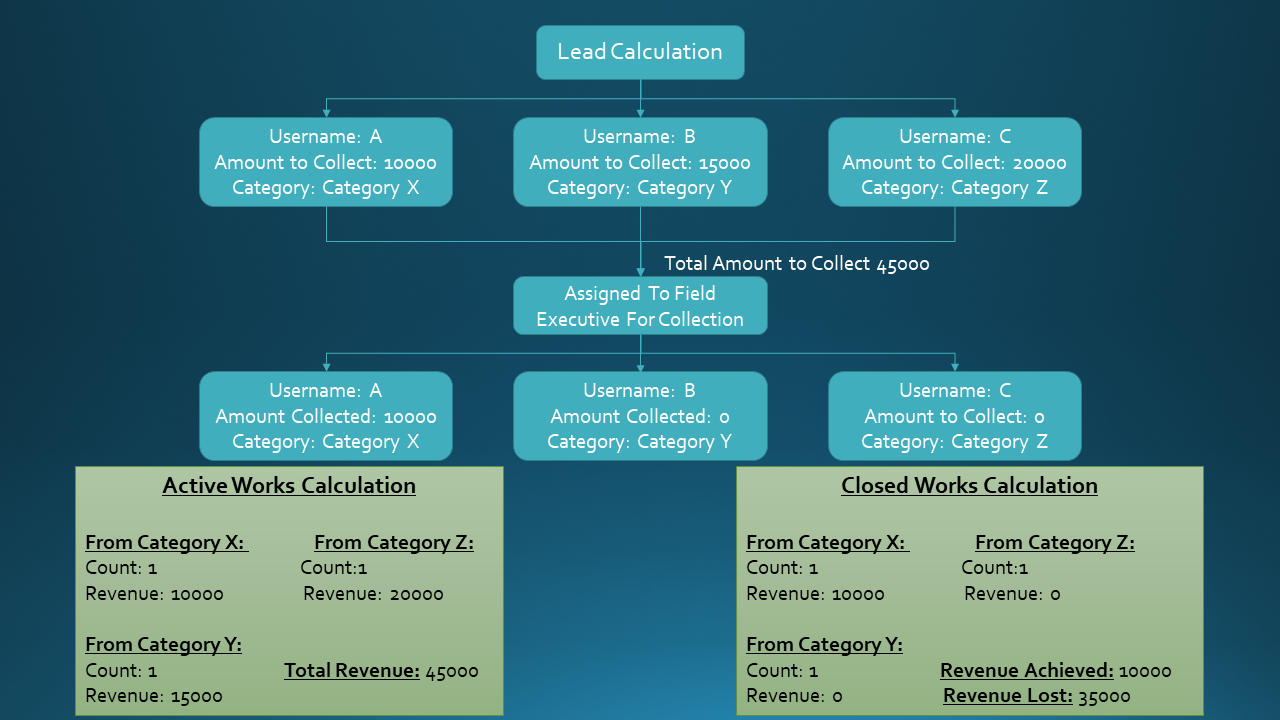 The Active Works dashboard provides total revenue that needs to be collected from different lead categories.