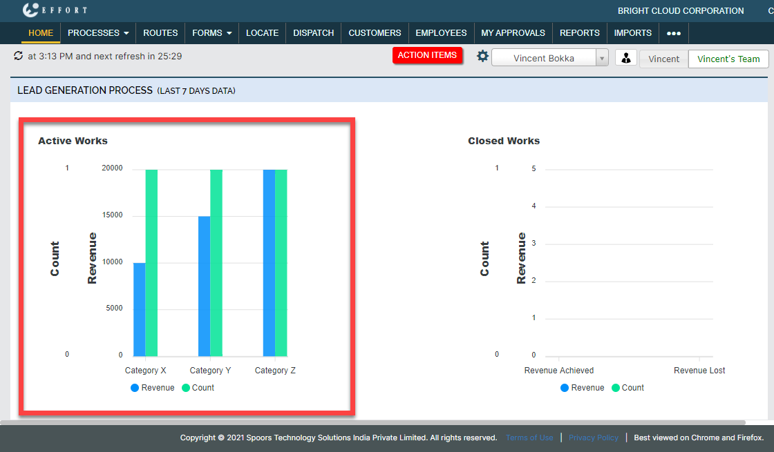 You have assigned three leads to an executive. The executive has to visit three leads and collect 45000. This scenario is displayed under the Active Works dashboard. All the newly created works can be visible on this dashboard. You can see the below dashboard when you create new works.