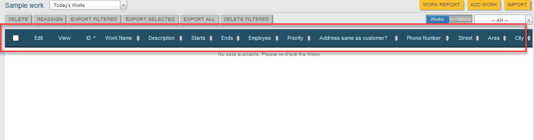 You can customize the visibility of work fields in the Web App works page. The selected work fields are visible in the web app as shown below.