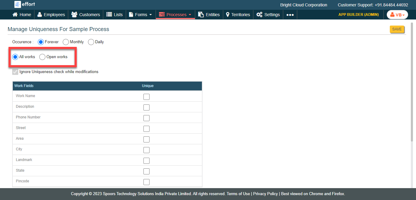 - All Works: Allows you to avoid works being created with the same values in a work field. If the user tries to create work with the already submitted values in the configured fields, the work will not be created.