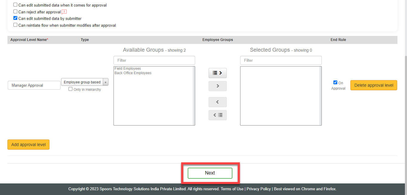 - Optional: Click the Add Approval Level button again if you want to add more approval levels.