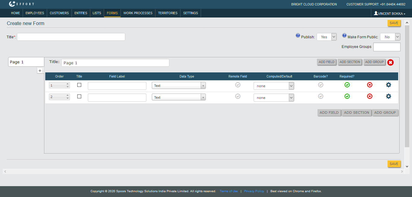 - Optional: Click Add Section and Add Group to add repeating group of fields as needed.