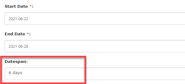 ![]() As shown in the above image, the value in the datespan field gets calculated automatically based on the Start Date and End Date fields. |