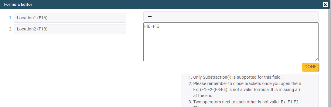 This data type helps you calculate the distance between two locations. To do this, you need to add two location data types and one location difference data type. To calculate the distance, you need to define the formula in the grey box located under the Computed field. Refer to the following screenshot for a sample configuration. ![]() Here is the formula defined below.