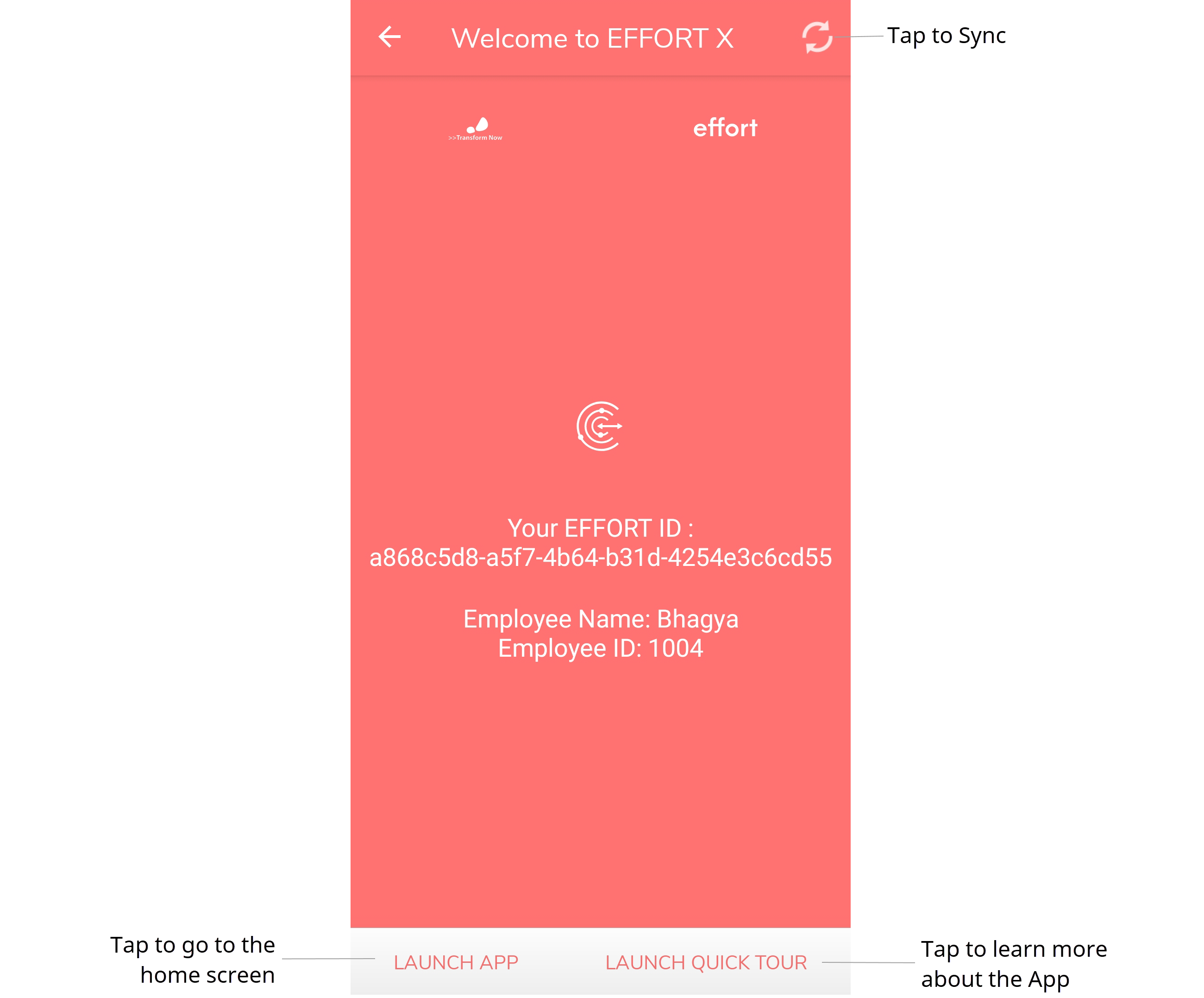 The Welcome to EFFORT Plus screen appears with EFFORT ID, employee name, and employee ID.
